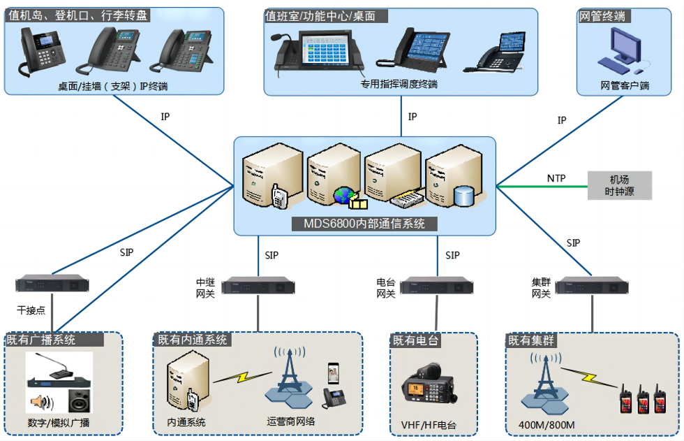 机场内通系统由MDS6800多媒体调度通信系统、一体化调度台及设置于各业务处室的IP可视电话、IP电话构成,主要为值机岛柜台、登机口柜台、车队、保洁等各业务部门给予一键直通式的语音通信,并支持与本地市话、机场广播、无线集群等系统互通,具有单呼、组呼、会议、广播、强插、强拆、转接、代答、呼叫队列、一触即通、集群对讲等调度通信功能,使用人员操作一触即通,被叫无需操作应答,调度业务信息传递迅捷,为机场各专业部门调度命令下达,作业协作给予轻松、灵活、高效的通讯工具。
